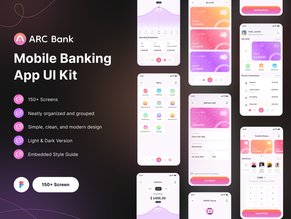 ARC Mobile Banking App UI Kit supports you with free font, pixel-perfect design, support organized layers, available Light & Dark theme, and also a global style guide.